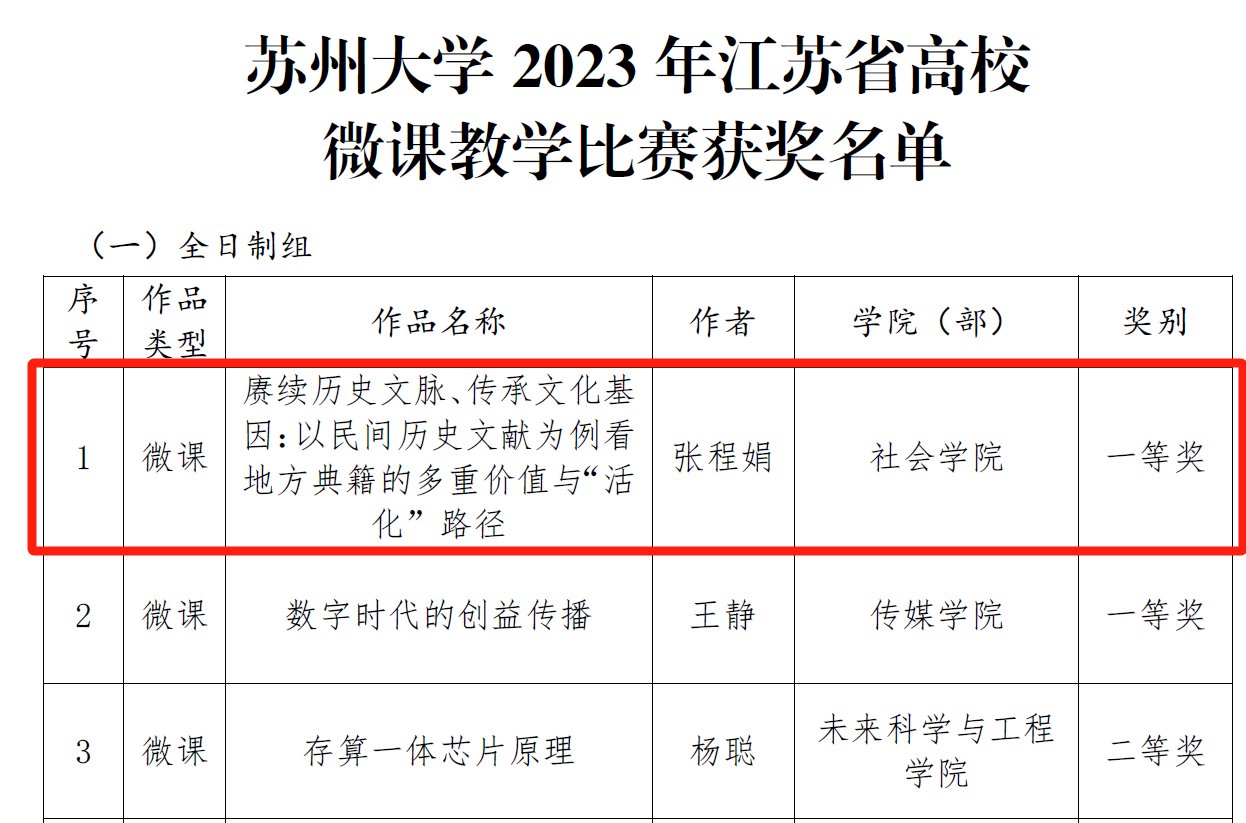 近日,江苏省高等学校教育信息化研究会公布了2023年江苏省高等学校微课教学比赛获奖名单,我院张程娟老师的参赛作品《赓续历史文脉、传承文化基因:以民间历史文献为例看地方典籍的多重价值与“活化”路径》荣获一等奖,为苏州大学本届所获2项一等奖作品之一。