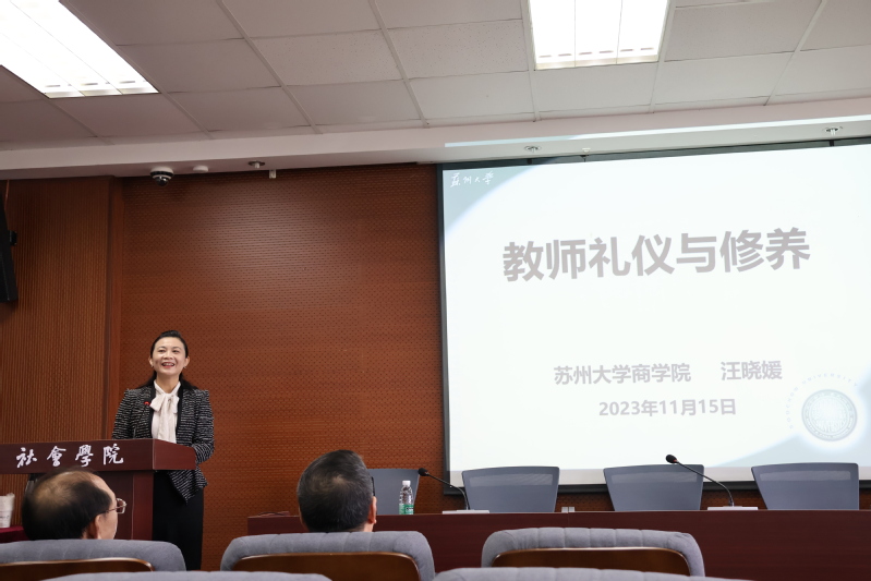 会议首先进行课程思政暨青年教师能力提升工程系列培训——教师礼仪专题。商学院汪晓媛副教授进行了题为《教师礼仪与修养》的讲座,她从礼仪的内涵、教师的仪容、教师的仪态、教师的着装、教师的言谈、教师的行为举止、教师的社会交往以及工作场合的一般礼仪等八个方面进行讲述,在讲解过程中不时为在座的教师进行生动具体的礼仪示范,汪教授精致的妆容、优雅得体的举止、清晰明确地表达、恰到好处的肢体师范给大家留下了深刻的印象。