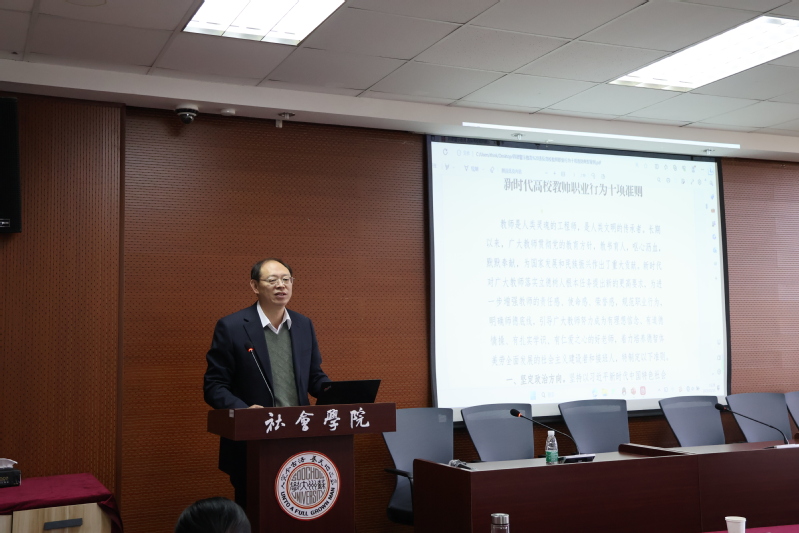 邓国林按照学校党委教师工作部有关要求,领学关于师德师风的相关文件规定。他带领大家学习了新时代高校教师职业行为十项准则、《违反高校教师职业行为十项准则典型案例》等内容,他强调,希望各位老师会后再认真学习相关文件,不断提高思想认识,杜绝违规行为发生,牢记师德建设永远在路上,大力弘扬教育家精神,为强国建设民族复兴伟业作出新的更大贡献。