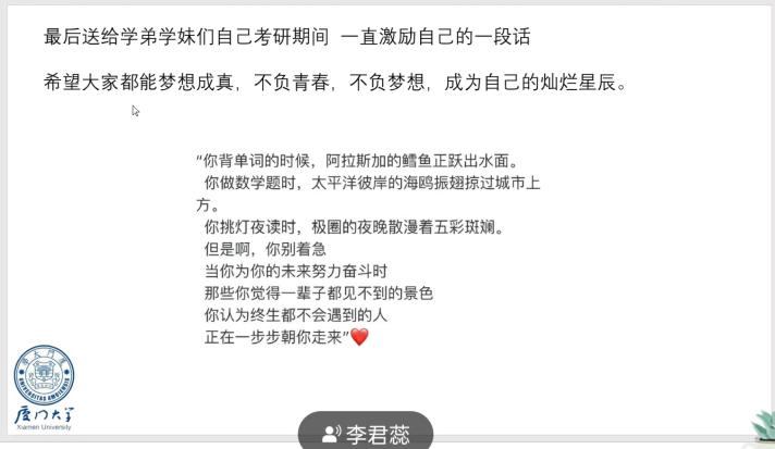 孙欣茹学姐指出在漫长的学习过程中,面对繁重的压力,难免会有否定自己的时候,但这时候一定要鼓励自己,不要放弃,可以找靠谱的“研友”相约共同战斗。孙学姐还强调了扎实的努力并非要求没日没夜的学习,也忌讳自我感动式的浪费时间。除此之外,孙学姐也提醒同学们英语的重要性,并建议尽早积累知识。