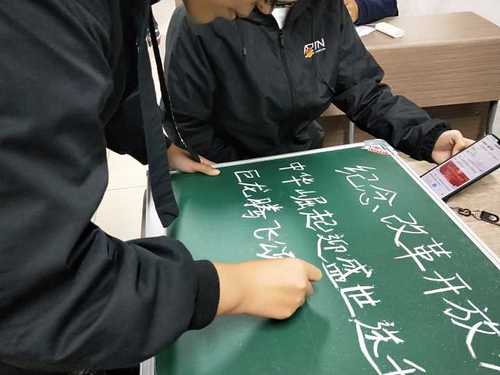 随后进行的是“专业天地”环节。所有同学以宿舍为单位分为九组,每组各带两块黑板,分别书写和描画出自己心目中的改革开放。环节尾声,同学们手拿自己的满意成果在讲台上一同合影,记录下了这美好瞬间。