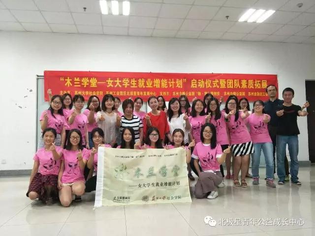 2017年7月1日下午,由苏州工业园区北极星青年发展中心与苏州大学社会学院联合举办、苏州市巾帼公益园“融爱”公益服务微创投支持的“木兰学堂——女大学生就业增能计划”启动仪式在苏州大学独墅湖校区圆满落幕。苏州大学社会学院董娜老师、马竞飞老师以及苏州市妇女联合会代表张金娜女士、苏州工业园区北极星青年发展中心代表薛楠女士出席了启动仪式,共同见证了“木兰学堂”项目顺利启动。