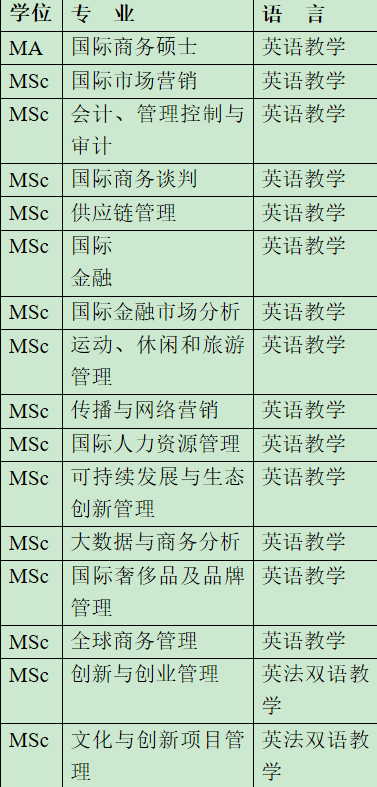 管理硕士采取全英文授课,学制15个月,其中课程9个月,实习4-6个月。学习期间包括2周的欧洲其他国家交流学习(Winter Session)。可选择德国、西班牙、比利时、英国、荷兰、意大利、爱尔兰等国的合作高校,包括荷兰阿姆斯特丹大学、爱尔兰都柏林大学等。交流内容包括:社会企业责任或国际战略管理课程学习,文化活动和企业参观等活动。硕士学习期间,学校免费提供不同级别的法语必修课程。