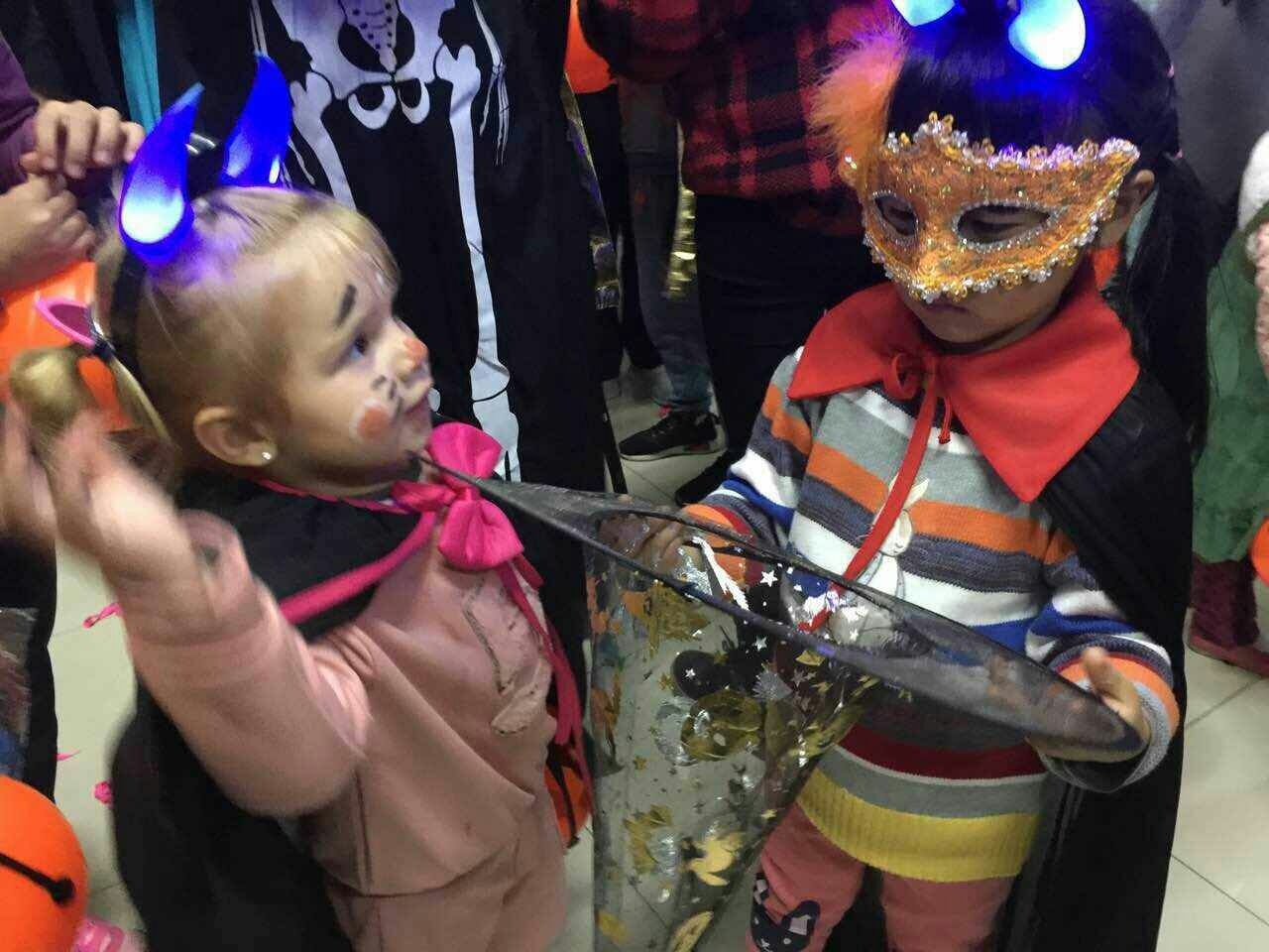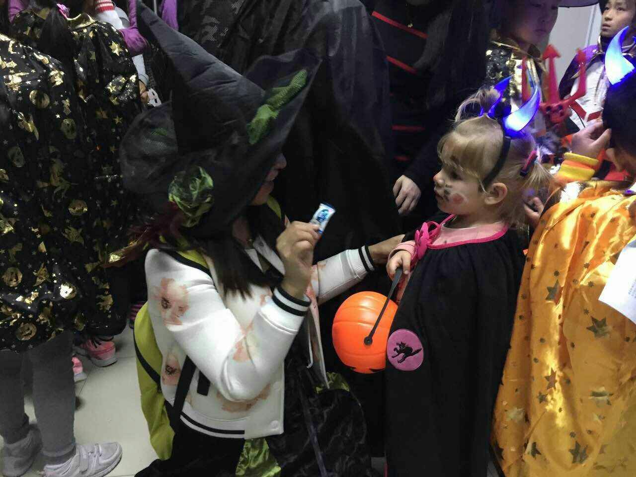 小孩子们在经过简单的分组之后活动正式开始。首先进行的是开场小故事,南瓜灯杰克指引亡魂的传说深深地吸引了小朋友们,之后的有糖问答也让气氛更加愉快。第二个游戏是气球大碰撞,各种气球爆炸声中每个小孩子都笑开了花。之后的魔术数独表演也引得小朋友连声惊叹。最后的不给糖就捣蛋更是把活动推向了高潮,巴西小姑娘Gabe初参加万圣节活动显得有些羞涩,但随着气氛的增长,她也慢慢融入到小朋友中来,随着大部队一户一户大喊着“不给糖就捣蛋”讨要糖果。