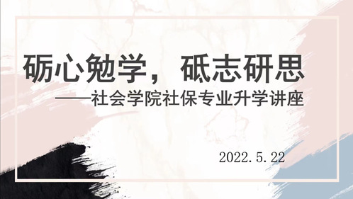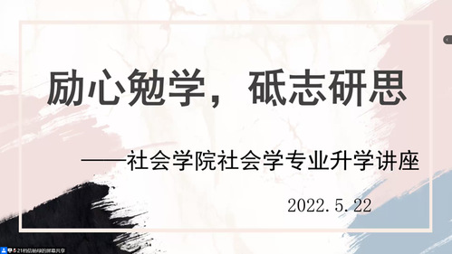 2022年5月22日下午3点,由苏州大学社会学院学生会承办的“研”为心声,“研”而有信系列活动以腾讯会议的形式于线上召开。此次活动旨在考研经验分享,为社会学院有意愿推免、考研的同学提供帮助,帮助他们明确目标;也可帮助同学根据自身的实力和兴趣,客观地进行自我定位,合理地选择学校和专业方向,进而促进年级间的学习交流,加强学院的学风建设。