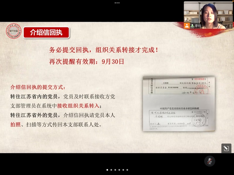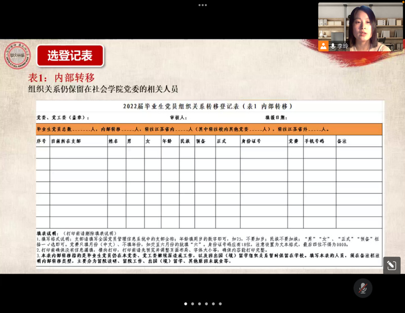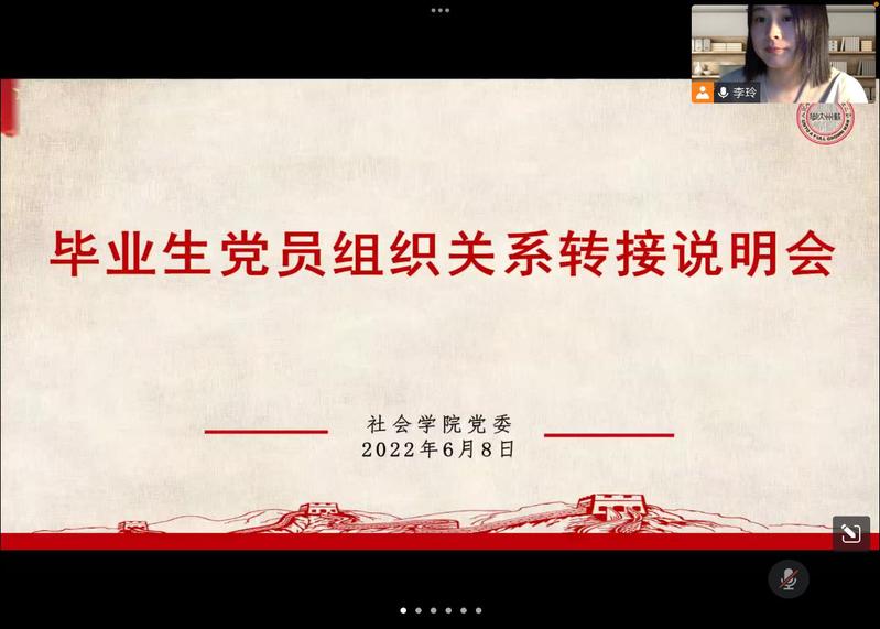 为确保毕业生党员组织关系转接工作落实到位,强化学院党员规范化管理,6月8日晚,社会学院党委线上举办2022届毕业生党员组织关系转接说明会。本次说明会由学院组织员李玲老师主讲,学院2022届全体毕业生党员参加会议。