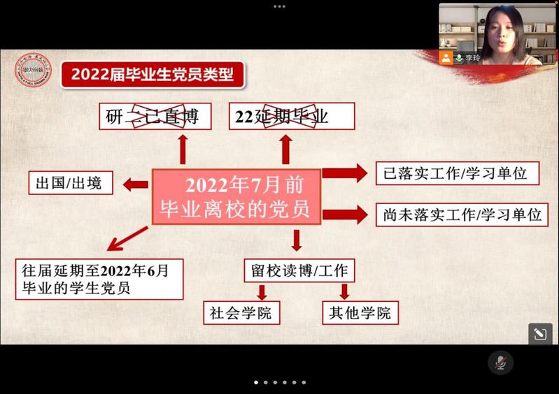 紧接着,李老师根据毕业生党员升学、工作、留校、出国等不同毕业去向,分类对相应的党组织关系转出流程做具体介绍。