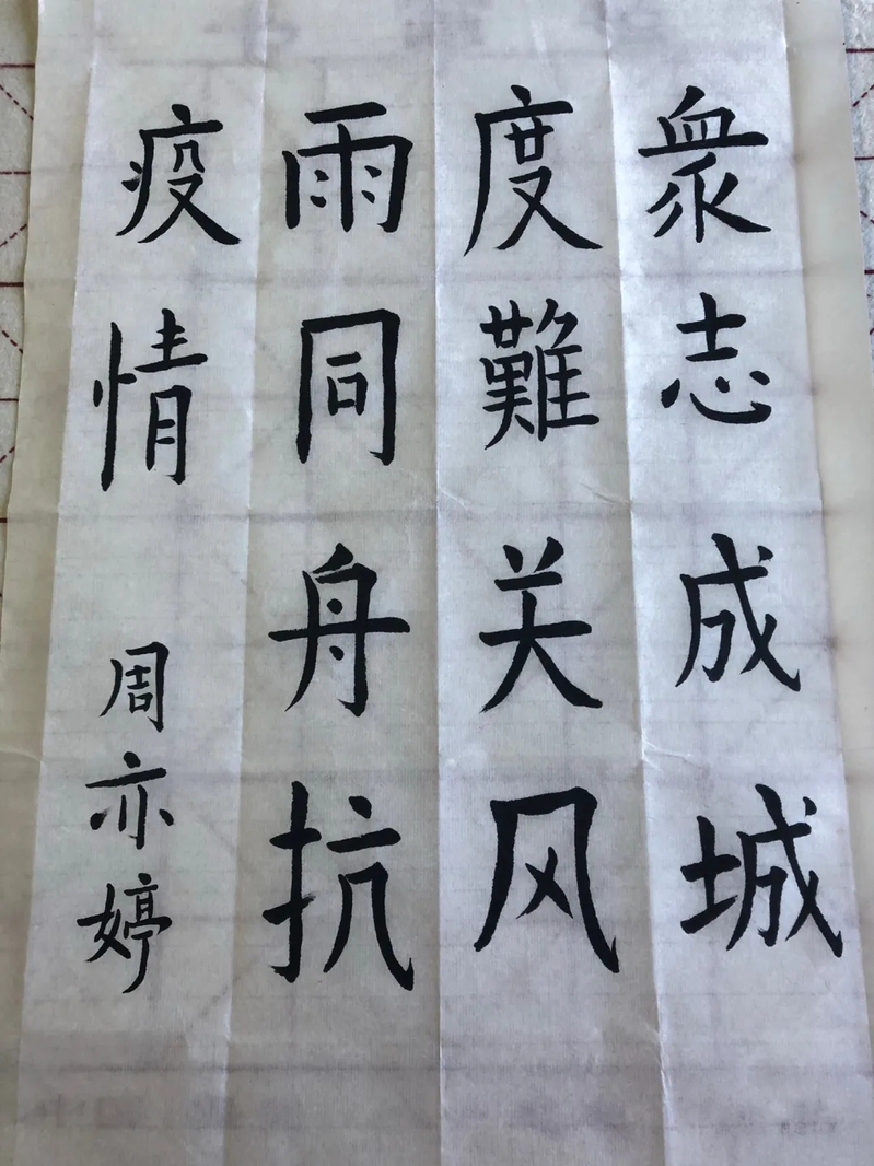 一份是周亦婷同学所写的"众志成城度难关,风雨同舟抗疫情"的书法作品,周同学所写作品笔酣墨饱、笔墨横姿、一字见心,语句平仄有韵、对仗工整,表达出了全国人民团结一致共抗疫情的伟大决心,与抗疫必胜的坚定信念。