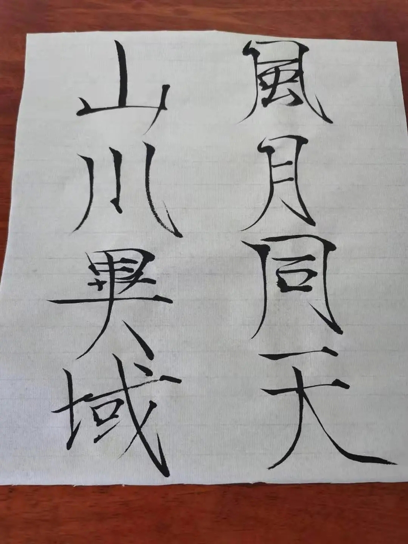 另一份是廖景儿同学"山川异域,风月同天"的书法,字形正倚交错,线条粗细变化明显,跌宕有致。这位同学引用名句,表达出了不同国家不同地区的人民,在危机关头,能够互相帮助,互相扶持,蕴涵着人类命运共同体的理念。