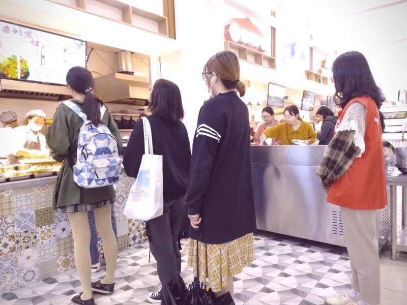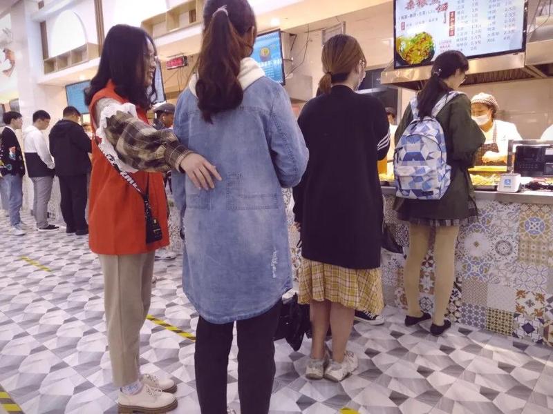 志愿者服务时间正是食堂人数最多的时段,学生们蜂拥进入第七食堂,几乎每个窗口都排起来了长队,但由于大部分同学都在低头玩手机,队伍歪七扭八。食堂志愿者主要负责劝说同学们有序排队,维持好秩序。“请同学们排好队”虽然是简单的一句话,但在每个窗口,每支队伍的前后不断重复,无疑是对志愿者的挑战。在志愿者们的努力下,七食堂呈现出秩序井然的风貌,学生们的就餐有条不紊地进行着。