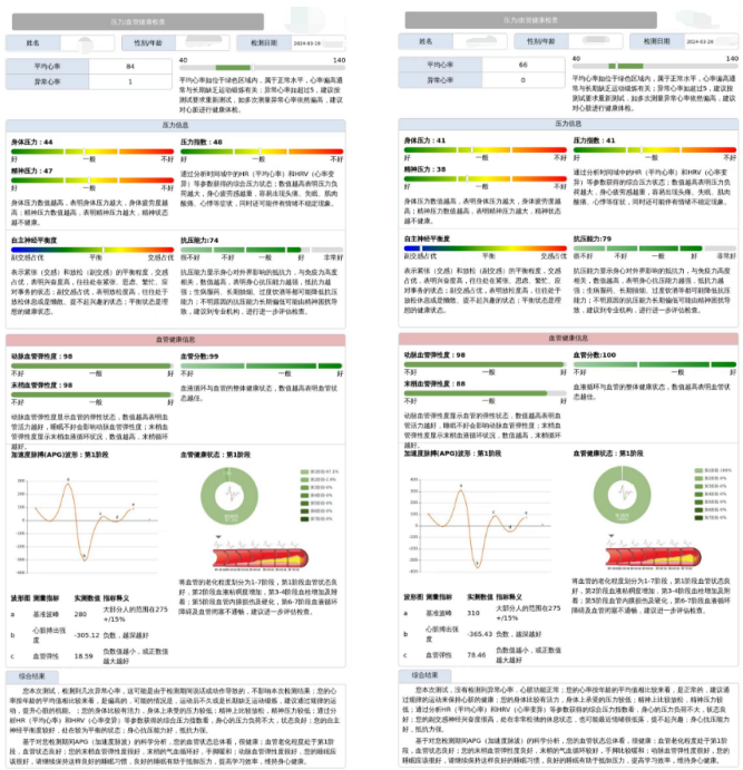 本次心检活动采用的是指夹式光容积血流血氧传感设备(简称“指压仪”),可实时检测并显示脉搏,分析心率的微小变化,测量自主神经系统功能和压力状态,以及血管老化度和血液循环状态。它能够从六个方面采集被测者的生理-神经指标数据:分别是(1)自主神经平衡度;(2)身体压力;(3)精神压力;(4)抗压能力;(5)压力指数;(6)动脉和末梢血管健康度。系统针对这些生理-神经指标数据建模分析,计算得到被测者的“压力/血管健康检查报告”,并为被测者提供促进身心健康的建议。