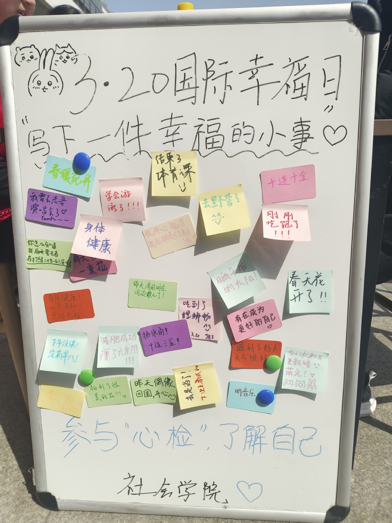 为促进大学生心理健康,丰富大学生课余活动,帮助大学生深入了解自我、提升幸福感,社会学院本科生发展支持中心、学生事务与发展中心于2024年3月20日中午11:30-13:00,在苏州大学独墅湖校区南区五六食堂前组织开展了“3·20国际幸福日”“你我互陪伴”之心检活动。