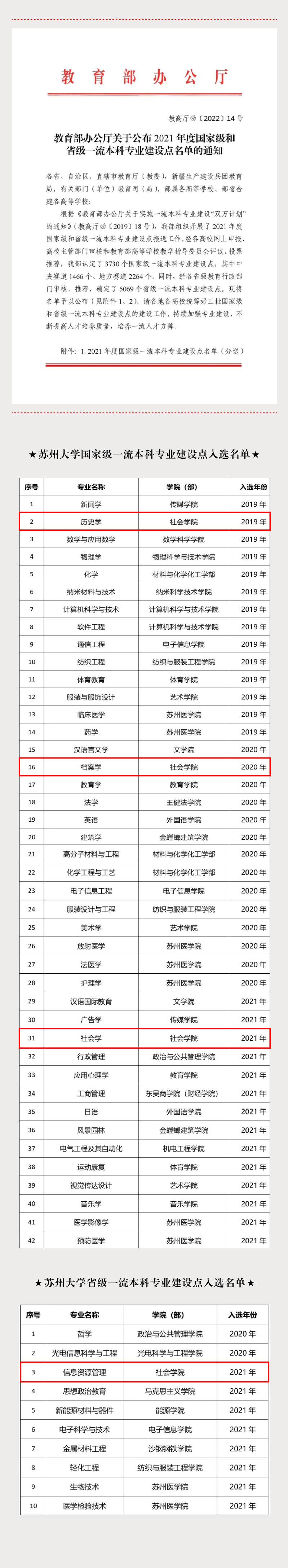 祝贺我院社会学专业入选2021年国家级一流本科专业建设点,信息资源管理专业入选省级一流本科专业建设点。至此,我院共有国家级一流本科专业建设点3个(历史学,档案学,社会学)和省级一流本科专业建设点1个(信息资源管理)。