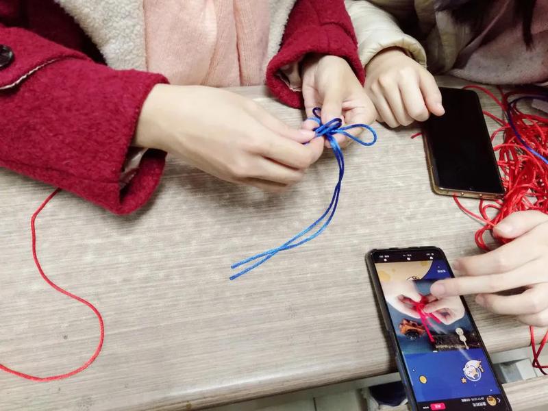 活动过程中,有的同学在编制的时候遇到了问题,感到没有头绪,组织方也积极主动提供帮助,为同学提供指导和建议,帮助共同制作精美的中国结。期间由于剪刀只有两把,大家互相传用,融洽相处、友好交流,碰到不懂的编法,大家会互相询问和交流。