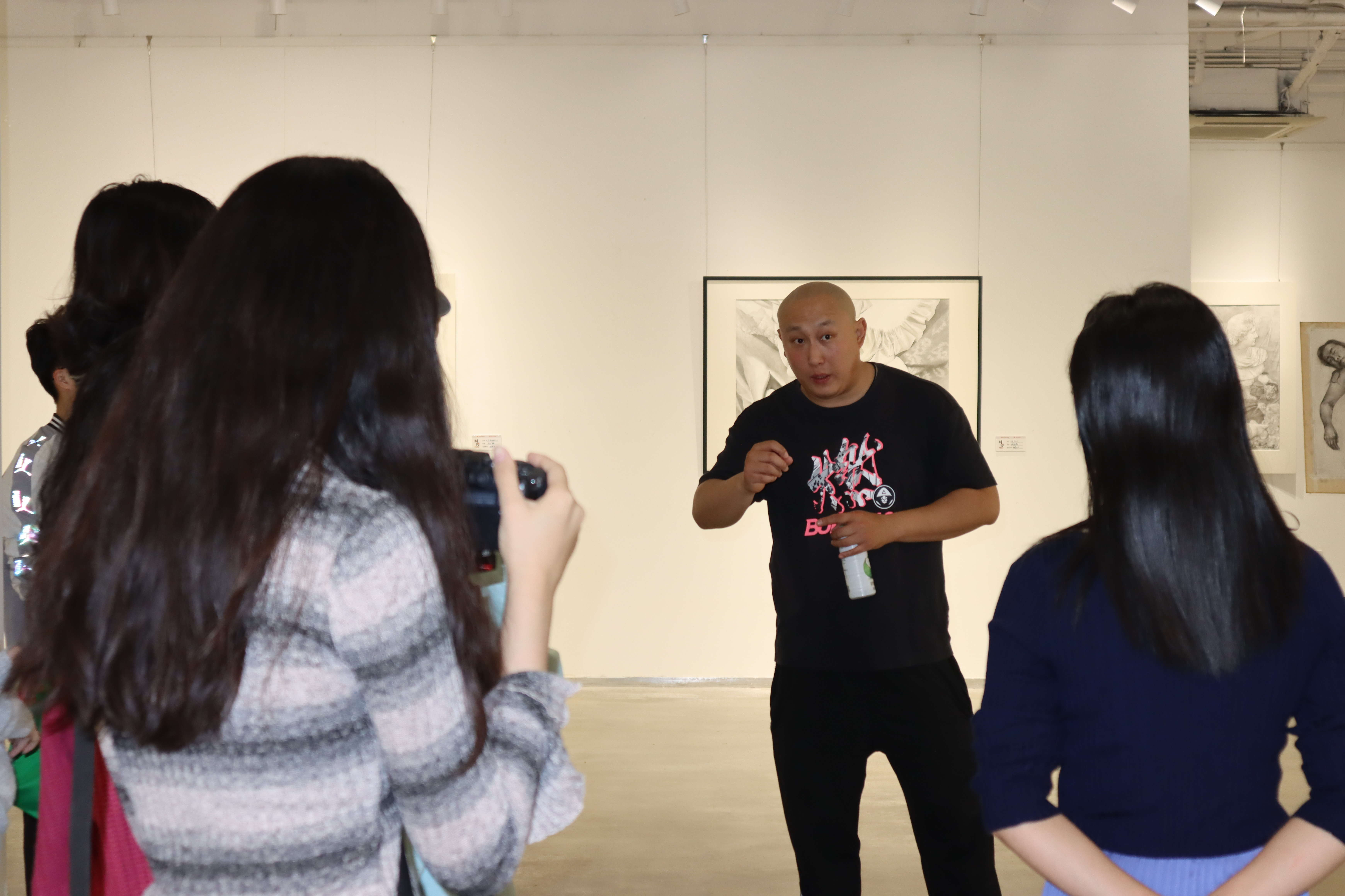 在参观的过程中,学院专门邀请了艺术学院美术系张意泊老师、18油画毕业生李圆圆、参展学生蒋吉雅、胡湘艺、傅江讲述创作灵感、创作过程、创作技法,进一步帮助大家加深对于作品的理解,得到新的启发。同时也有同学主动分享自己对于某一幅画的感受与见解,与大家进行交流讨论。