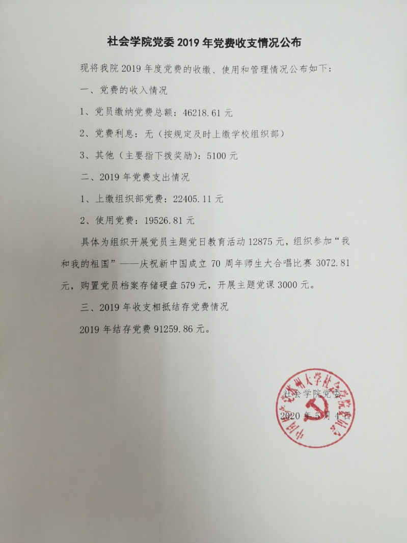 社会学院党委2019年党费收支情况公布