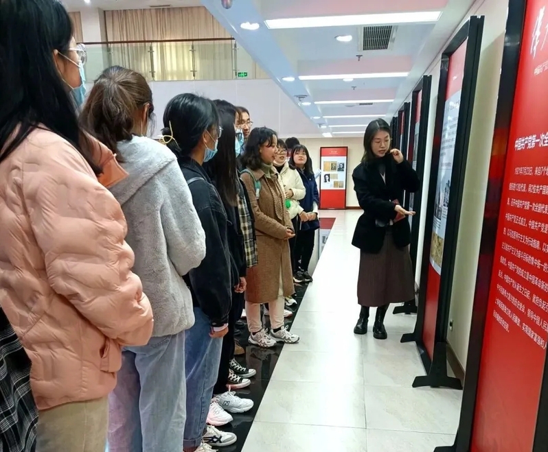 进馆后,一行人在老师带领下走进中央游泳池,经讲解老师介绍,泳池一周摆满的介绍中国共产党的展牌共分为三个单元。