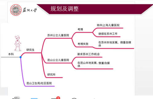 介绍完毕后,第十五届职业规划大赛一等奖得主,医学院吴春雨同学向大家分享自己的参赛经验。对于职规大赛,吴同学建议同学们可以先在苏大官方网站填写职业兴趣测验,找到自己感兴趣的方向,然后在其他一些职业测评网站上找找历届各种职业规划赛事的优秀作品,学习参考别人的成果。吴春雨同学展示了自己的参赛作品,结合自己的经历,讲解了完成整个作品的思路和流程。接着,吴同学展示了自己根据专业,对自身进行自我兴趣探索,并结合疫情确定自己的初步职业方向与未来发展路线的多种选择。