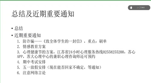 马竞飞老师公布了一些近期通知。对于最近频发的诈骗活动,她列举了几种诈骗形式,并提醒同学们不攀比,保护个人信息,掌握反诈知识。关于大学生的情感教育,学院在接下来几个月会陆续开展各种情感教育活动。就大学生日常的心理健康问题,马老师向同学们普及了热线电话以及心理值班表。关于期中考试以及后续几个月的节假日安排,马老师也向同学们公布了具体细节。最后,对于大学生在网上的言论,马老师也对同学们作了提前忠告,希望日常在上网时谨言慎行。
