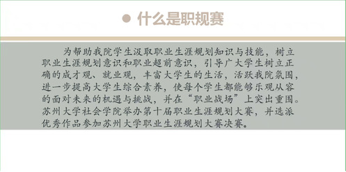 学生事务与发展中心职规部的顾清颖向同学们介绍职规赛的定义,由院级赛到校级赛再到更高级赛事的基本流程,以及报名大赛时的一些注意事项。由此,同学们对于职规赛有了初步了解。