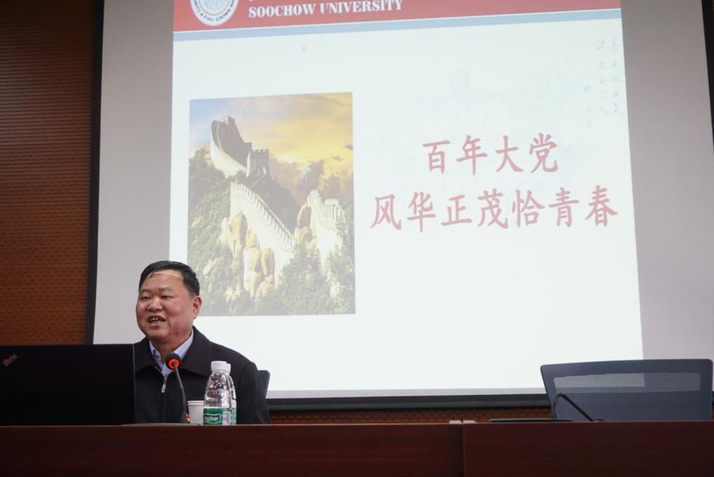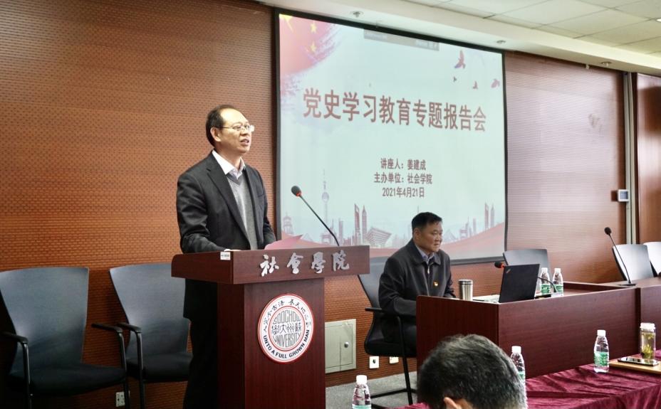 为深入学习贯彻习近平总书记在党史学习教育动员大会上的重要讲话精神,教育引导广大党员深入学习研究党的历史,全面宣传党的历史,扎实推进党史学习教育深入开展,4月21日下午2:00,苏州大学社会学院党委在独墅湖校区二期1005-5448学术报告厅举办了党史学习专题宣讲报告会。此次党史学习专题宣讲邀请了苏州大学马克思主义学院教授、博士生导师、苏州大学马克思主义研究院副院长、江苏省马克思主义研究会副会长姜建成教授。社会学院党委和行政领导班子成员、全体教师、学生党员代表和学生骨干聆听了报告,社会学院党委书记邓国林主持了宣讲会。