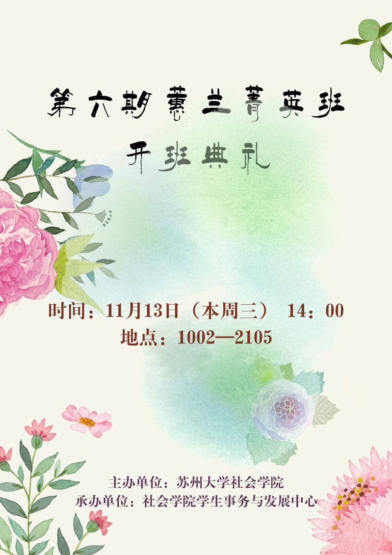 2019年11月13日14时,由社会学院主办,社会学院学生事务与发展中心承办的蕙兰菁英班开班典礼在文综楼1002-2105举行,出席本次典礼的嘉宾有社会学院党委副书记、副院长包军老师,学工办主任马竞飞老师,学生事务与发展中心理事长孙振同学。