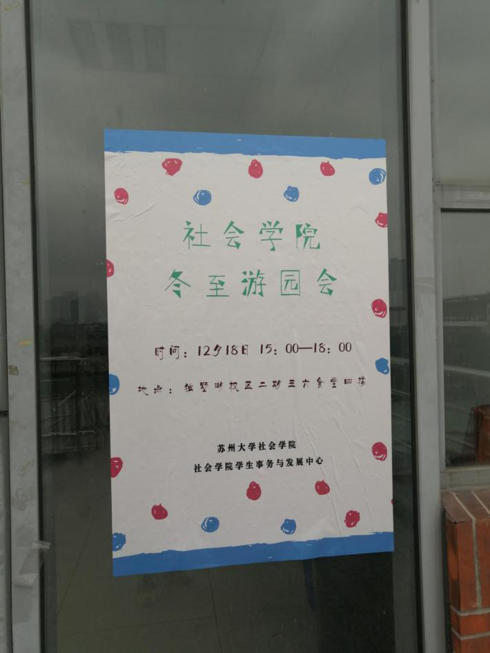 冬至,是我国农历中一个非常重要的节气,也是我国汉族一个传统节日。过了冬至,白昼一天比一天长,阳气回升,是一个节气循环的开始,也是一个吉日,应该庆贺。为进一步弘扬民俗文化,继承传统习俗,彰显传统文化魅力,展示大学生的青春风采,增进思想交流和拓宽同学们的兴趣爱好,缓解同学们的学习压力,在社会学院学生事务与发展中心的精心策划下,2019年12月18日下午三点在独墅湖校区五六食堂四楼成功举办了本次社会学院冬至游园会活动。