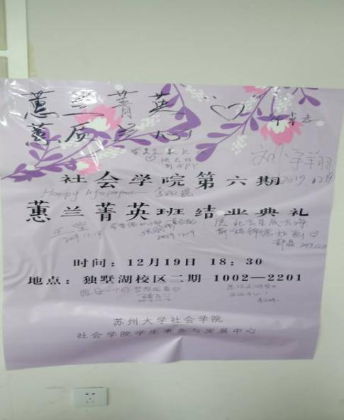 12月19日18时30分,社会学院第六届蕙兰菁英班结业典礼在独墅湖校区二期1002-2201教室顺利举行。社会学院学工办主任马竞飞老师,院学生事务与发展中心理事长陆瑜嘉同学、孙振同学,第五期蕙兰菁英班优秀学员代表赵静姝同学出席了本次的活动。