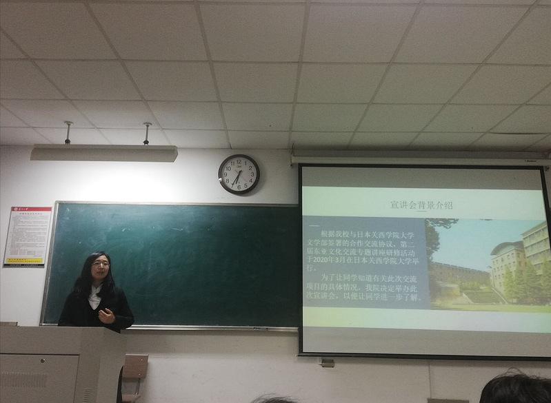 有日本研学经历、对日本研究深刻的张传宇教授的到来把宣讲会的气氛带入高潮。他认为东亚文化研修营是同学们难得的机会:此活动面向本科生,资助力度大,便于日后到日本进修学习,对同学们裨益良多。随后他介绍了关西学院大学所在地兵库县西宫市的地理经济概况,补充了马昊天同学所讲。