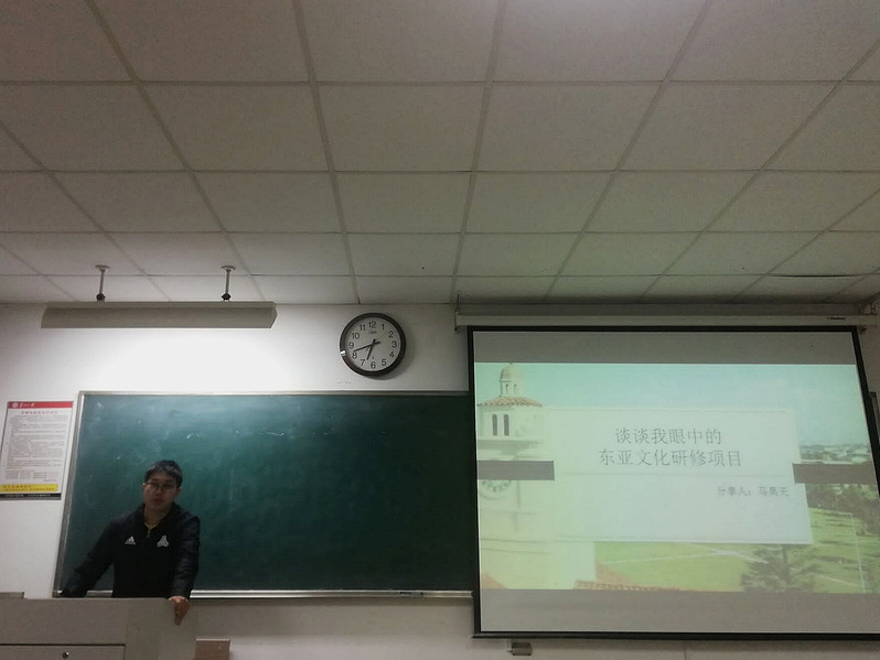 接着,马昊天同学上台分享了他在第一届东亚文化研修营的所见所感。首先,马昊天同学对合作院校——关西学院大学作出了简明介绍,追溯了关西学院大学与苏州大学的渊源。接着,他鼓励同学们思考与出国研修、在日本学习中国史相关的问题,并以“五四三二一”为线索,介绍了在研修营的五天行程、四样收获、三位老师、两点遗憾和一个理想。在行程部分中,马昊天同学对当地食宿、每日活动、小组讨论报告等作出了翔实的介绍,分享了切实的感受。谈及收获,主要是研修的成绩、外国名校访学的经历、异国他乡的朋友以及思想上的转变。日本同学的充分准备、对中国文化的了解和对东洋史的热情给马昊天同学带来了惊讶与思考,严谨、守礼的日本文化更使他印象颇深。然后,马昊天同学介绍了印象深刻的三位老师,提到了研修后的遗憾——没有把讨论内容进行整合、没有机会向学院建议购买工具书,这也是对第二届研修营的一种期望。最后,马昊天同学表明了研修过后确立的理想:师夷长技以自强。研修营促使他思考中日同学思维方式的区别以及造成区别的原因,并坚定了他本人深造东洋史的志向。