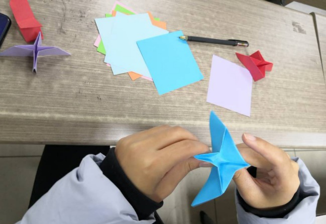 接下来便是趣味满满的“爱心折纸”环节,在主持人讲解的指导下,同学们用手工纸折出一个个精美可爱的“爱心”和“千纸鹤”。折纸虽小,情意却真,它承载了同学们的匠心,寄托了同学们对父母等生活中重要之人的感恩与祝福。折纸完成后,工作人员将一个个“爱心”和“千纸鹤”收集起来,拼贴在写有同学们话语的笔记本上,温馨可爱,更彰显了同学们的拳拳心意。