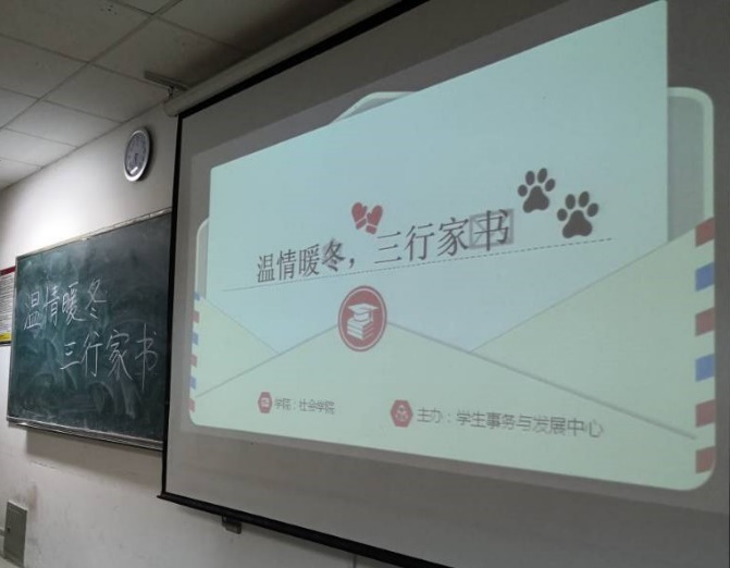 12月20日18时30分,社会学院学生事务与发展中心在1002-2102举办了本学期的“三行家书”活动,社会学院的同学们积极参加了本次活动。冬至即将来临,新年的脚步不断接近,本次“三行家书”活动传递了点点温情,为冬日增添了温暖色彩。