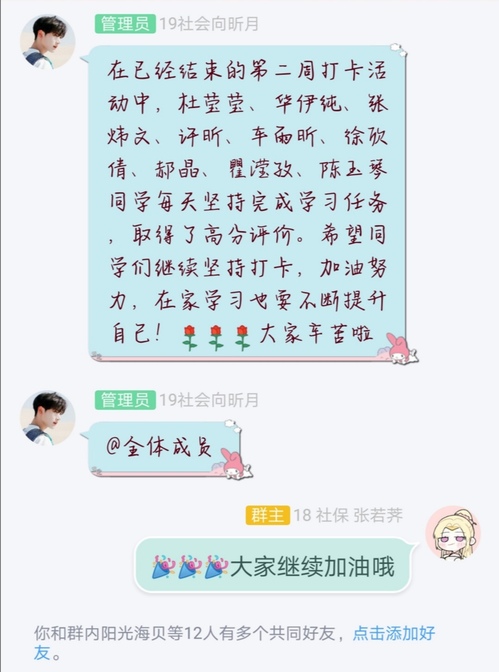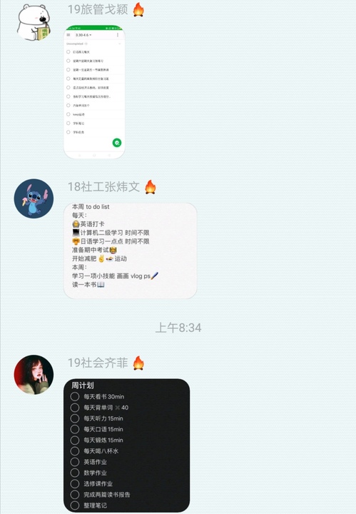 从每周的打卡情况来看,绝大多数同学都能完成自己定下的目标,而稍稍懈怠的同学也会被周围人充足的干劲所感染,开始奋起直追。同学们或是以一小段文字描述自己完成计划的进度,或是直接上传图片分享自己的打卡成果,每到打卡密集时间段,群内便会十分活跃,而工作人员一如既往地秉持着公平认真的态度为每位参与打卡的同学记录并打分。打卡群内学习氛围十分浓厚,不少同学都坦言此次活动使自己的学习自主性有所增强。
