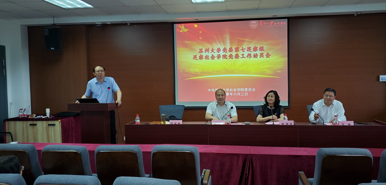 根据苏州大学党委统一部署,校党委第四轮巡察第七巡察组于6月3日起对社会学院党委开展巡察工作。6月3日下午,第七巡察组在独墅湖校区1005-5448学术报告厅召开巡察社会学院党委动员大会。第七巡察组全体成员、社会学院领导班子成员、党委委员、各办主任、团委书记、工会主席、系主任、支部书记参加会议。动员大会由学院党委书记邓国林主持。