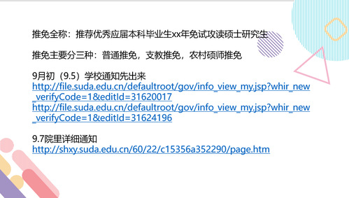 随后,王语欣同学开始为同学们简要区分推免的类别,并依次解释。初步介绍完推免的概念后,王语欣同学讲述了此次本校推免工作的操作方案和实施流程。