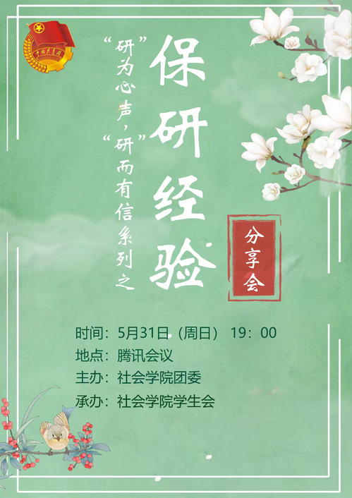 2020年5月31日晚上七点,为了让同学们更加了解保研推免的相关信息,由苏州大学社会学院团委主办、社会学院学生会承办的苏州大学社会学院保研专题讲座于线上腾讯会议举行。