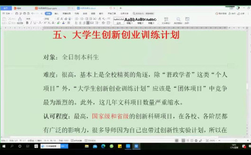 在春季学期科研项目方面,主讲人根据时间顺序向同学们介绍了莙政学者、导师/生交流站、大学生创新创业训练计划以及国家级、省级大创和校级大创中期和结项等六项科研活动,并从报名时间、报名条件以及相关获奖情况等方面进行了详细的说明,特别指出大学生创新创业训练计划是其中竞争最激烈也是认可度最高的一项科研活动。