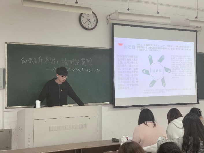 接着,他带领同学们简单回顾了清明节的相关背景知识,强调这是我国具有丰厚历史意义的传统节日,或许很多习俗会随时代变迁而淡化,但我们一定要传承坚守其精神内核。