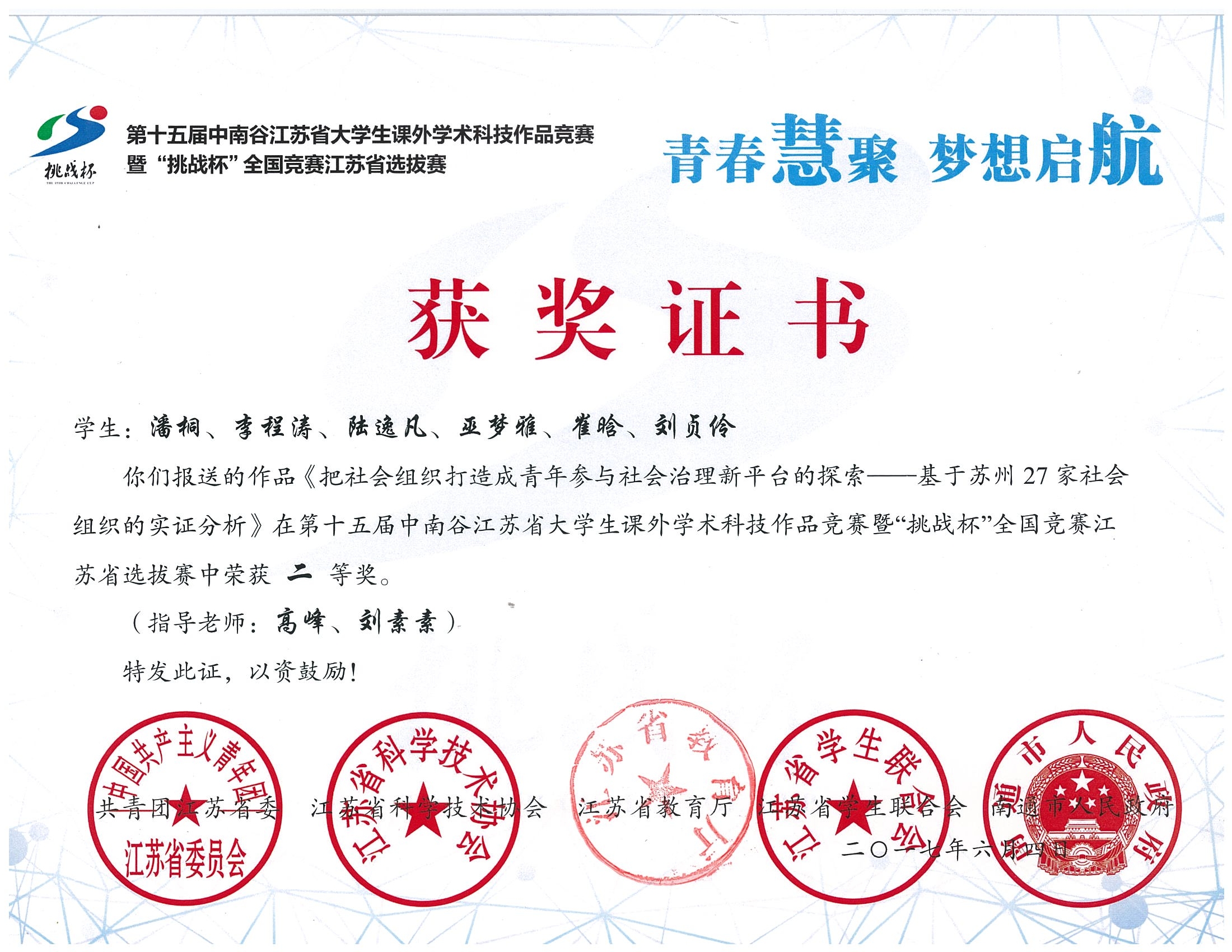 第十五届中南谷江苏省大学生课外学术科技作品竞赛暨“挑战杯”全国竞赛江苏省选拔赛二等奖