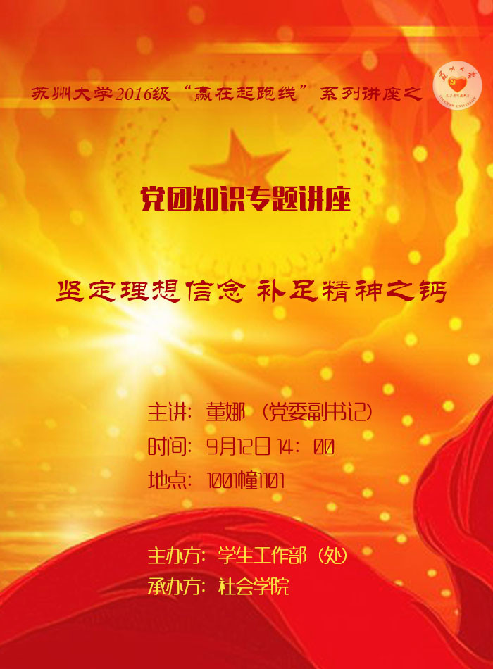 党委通知:苏州大学2016级“赢在起跑线”系列讲座之党团知识专题讲座(海报)