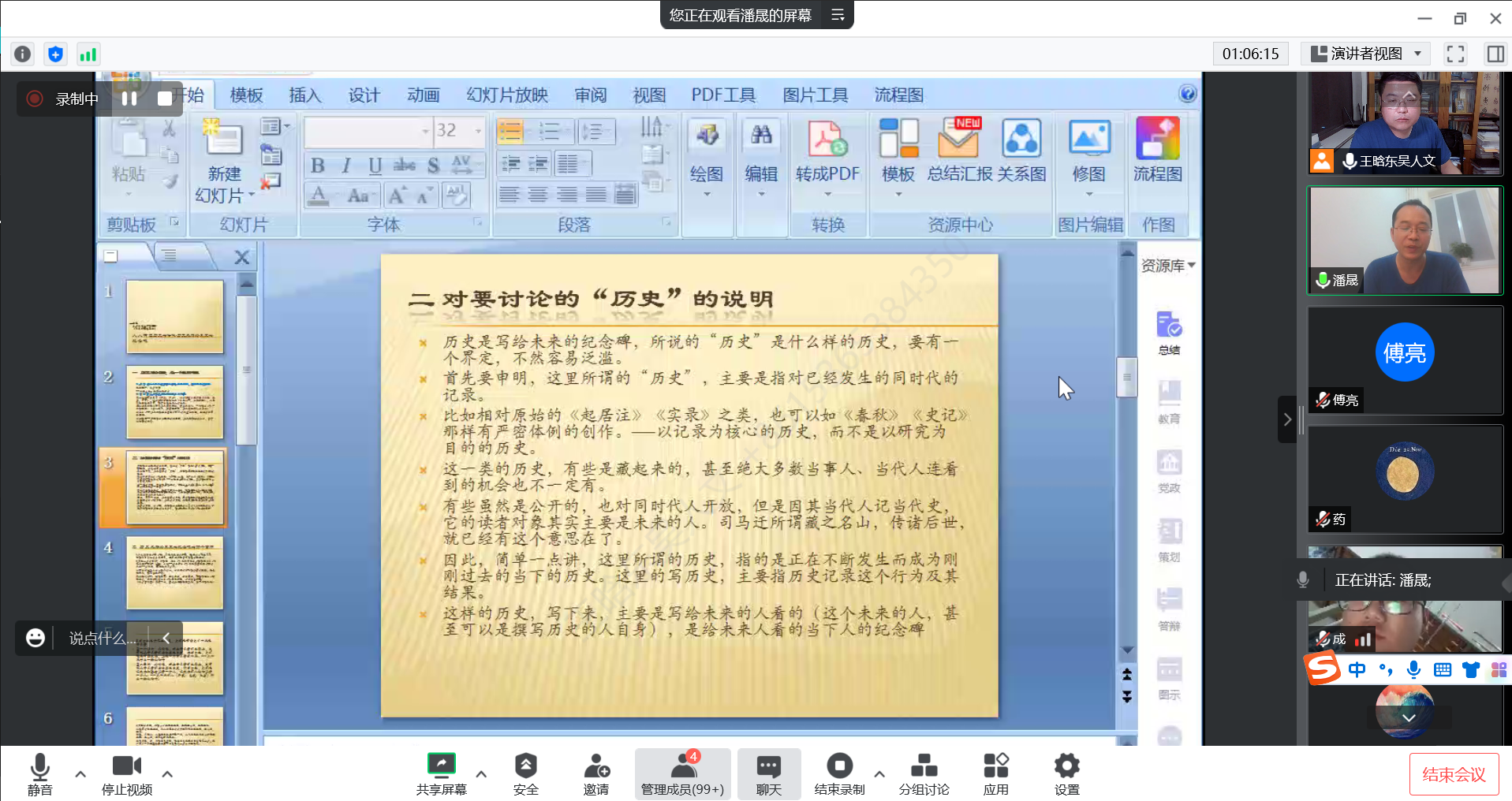 在第二部分,为了避免产生更多的分歧,潘老师首先对其要讨论的“历史”做了一个界定,将要讨论的“历史”限定为:对已经发生的同时代的记录,是以记录为核心的历史,而不是以研究为目的的历史。比如相对原始的《起居注》《实录》,或如《春秋》《史记》那样有严密体例的创作。