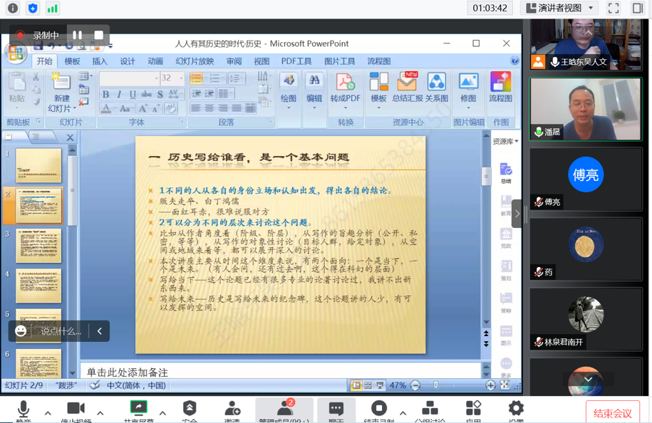 2022925日晚19:00,南京师范大学社会发展学院教授、博士生导师潘晟老师应邀于腾讯会议线上平台进行了主题为《人人有其历史的时代˙历史是写给未来的纪念碑》的讲座。本次讲座由王晗老师主持,本系侯德仁老师、傅亮老师,云南师范大学张永帅老师及各高校历史系老师、学生共计273人参加。此外,讲座还受到“历史地理研究咨询”、“明清史研究咨询”等多家学术公众号的关注和转发。