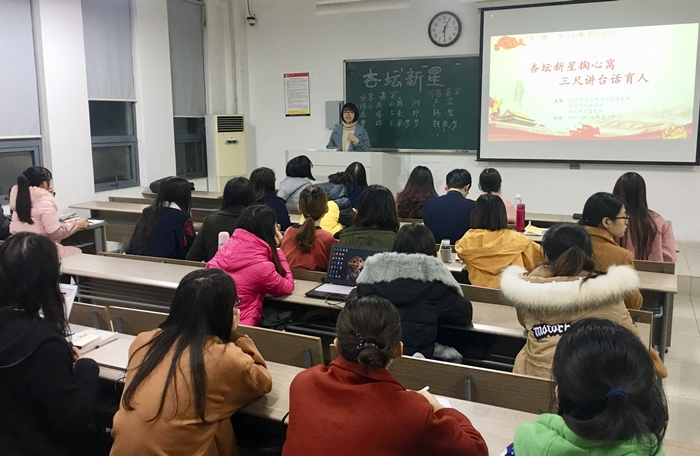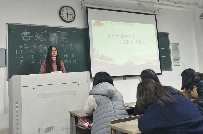 时值“双一流”建设正于各高校如火如荼的推进,社会学院本科生历史学系党支部联合2015级历史学(师范)团支部和社会学院杏坛社,结合师范专业特色,于11月30日晚在文综楼1002-2201开展了以“杏林新星掏心窝 三尺讲台话育人”为主题的“双一流 争当先锋”专题活动。本科生历史学系党支部全体党员、15级历史学(师范)全体团员、16级入党积极分子及17级学生代表参与了本次活动。学院党委副书记兼党支部书记董娜参加本次活动。