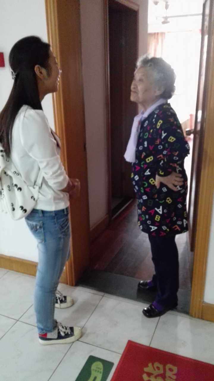 刚踏入大门,就听见一阵咿咿呀呀的戏曲声,几位老人坐在椅子上闭目倾听,时不时还哼唱两句。志愿者们不忍打扰他们的悠闲,便上楼看望其他老人。午睡过后的老人们精神饱满,陆陆续续从房间出来,都十分热情。有一位老爷爷主动上前跟志愿者们聊天,在交谈中志愿者们得知这位爷爷是一名出生在医生世家的中医,多年养生知识的熏陶使他看上去很年轻,完全看不出来已有87岁高龄。在交谈过程中,这位爷爷时不时露出笑容,与志愿者们分享他年轻时的故事。另外两名志愿者和几位老奶奶交谈,其中一名志愿者蹲在老奶奶旁边与她们聊天,好似一家人,温馨的画面触动在场每个人的内心。