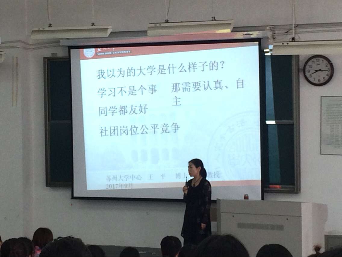 2017年9月12日上午8点,大学是创造美好自我的殿堂主题心理讲座在文综楼1001-1201举行。苏州大学社会学院2017级全体新生到场参加讲座,由苏南地区大学生心理健康教育研究中心的王平老师主讲。
