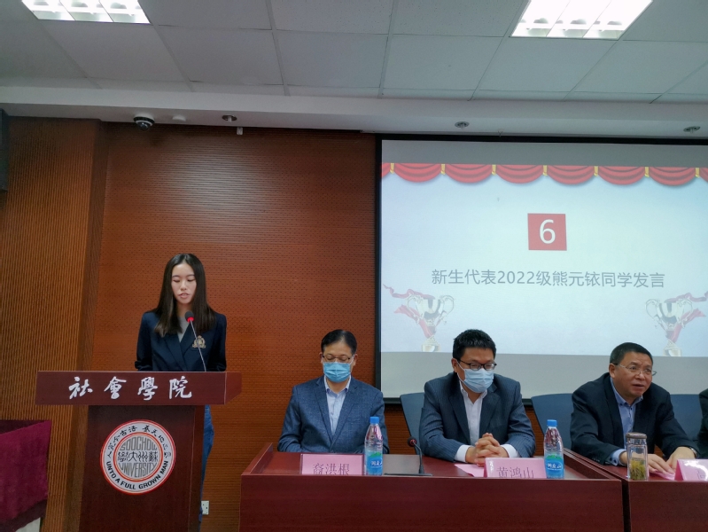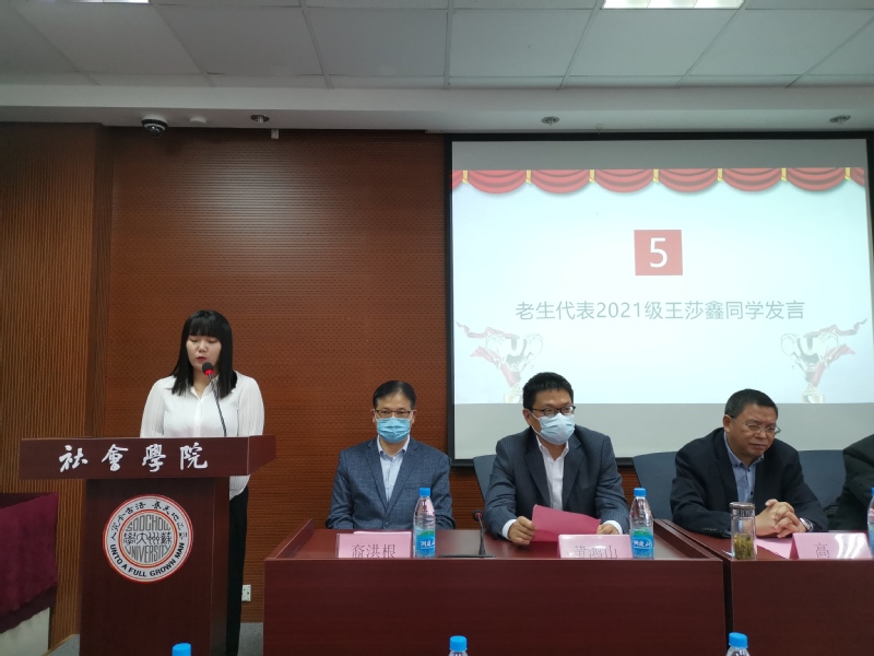 接着,2021级图书情报(专硕)专业的王莎鑫同学作为老生代表进行了发言。她向2022级新生讲述了一年来在苏州大学的生活以及取得的进步,导师们的教诲和研会的生活都使她获益良多。王莎鑫同学结合自己的经历向新生们分享了自己的心得体会: