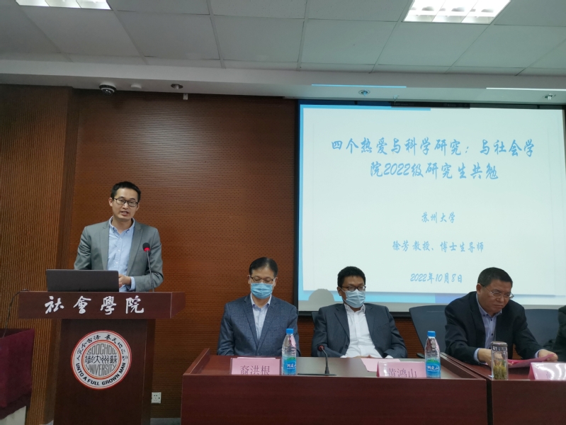随后,徐芳教授代表全体研究生导师从四个热爱与科学研究方面与社会学院研究生新生进行共勉。徐老师表示,我们作为新时代的青年,应做到热爱祖国、热爱科研、热爱生活与热爱自己。在科研上,兴趣是最好的老师,希望同学们因兴趣而热爱,选定方向,脚踏实地,把论文写在祖国的大地上。徐芳老师还饶有兴趣地分享了自己的博客主页,欢迎同学们前来交流。