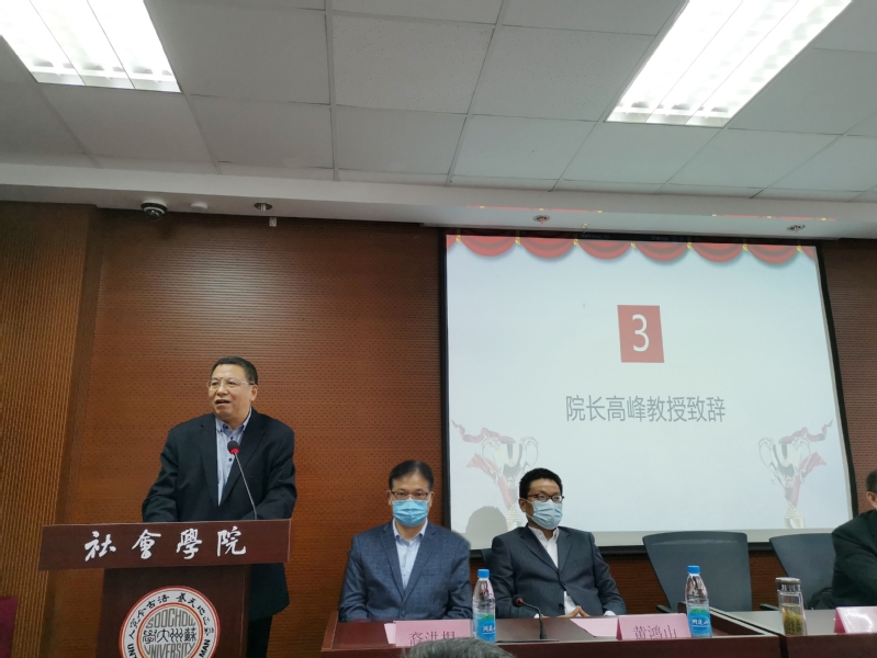 高峰院长首先致辞,他代表全院师生对顺利进入研究生阶段学习深造的同学表示衷心祝贺和热烈欢迎。高院长向同学们介绍了苏州大学和社会学院的发展历史,也让同学们更为详细地了解了学院在人才培养、科学研究、社会服务、文化传承创新以及师资队伍建设等方面取得的成就。高院长对2022级全体研究生新生提出了以下四点寄语:
