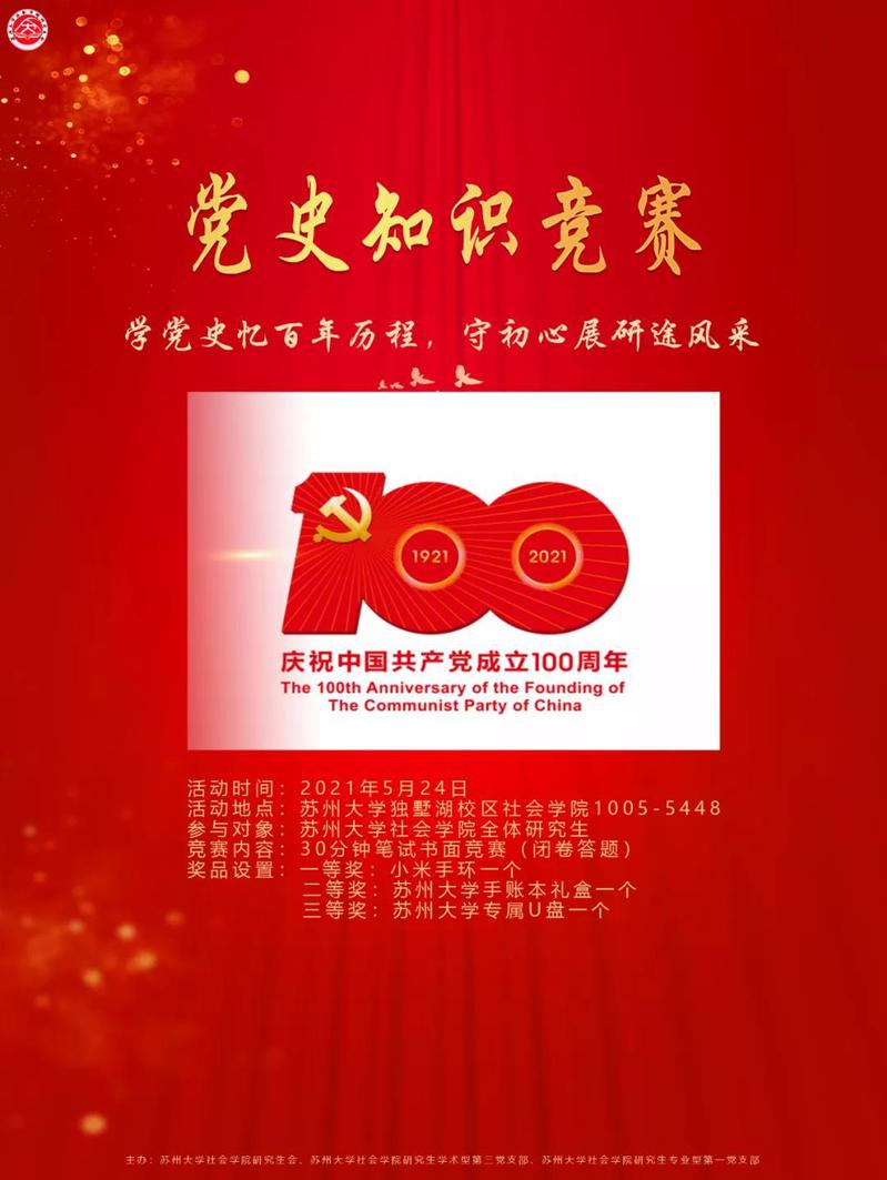 5月24日晚,苏州大学社会学院研究生学术型第三党支部、专业型第一党支部与社会学院研究生分会联合举办了“学党史忆百年历程,守初心展研途风采”党史知识竞赛。