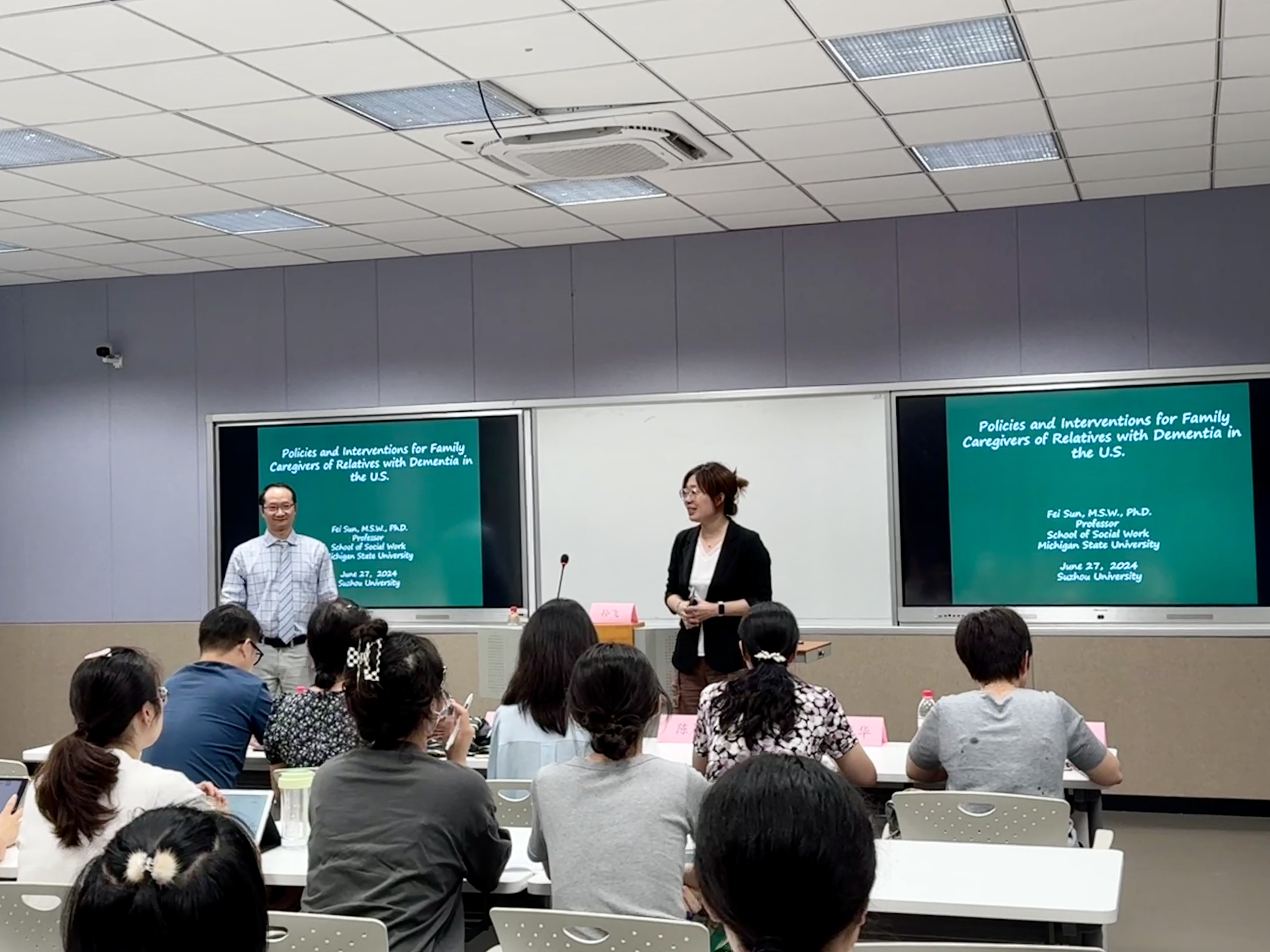 为了进一步加强我院社会工作专业师生的学术交流,提升学生的实践素养,社会学与社会工作系于6月27日晚上在文综楼5433室举办“东吴社会学”系列学术讲座。讲座由社会学院副教授、社会学及社会工作系副主任刘素素主持,特别邀请到了美国密歇根州立大学孙飞教授带来一场主题为《认知症家庭照料的支持政策和干预实践:美国的经验》的学术讲座。劳动与社会保障系陈红霞老师、李曼老师、刘欢老师,社会学与社会工作系陈晨老师参加了此次讲座。同时,讲座也吸引了来自苏州市委党校、常熟理工学院的老师参与,也得到了夏威夷大学马诺阿分校社会学系张微教授的现场支持。